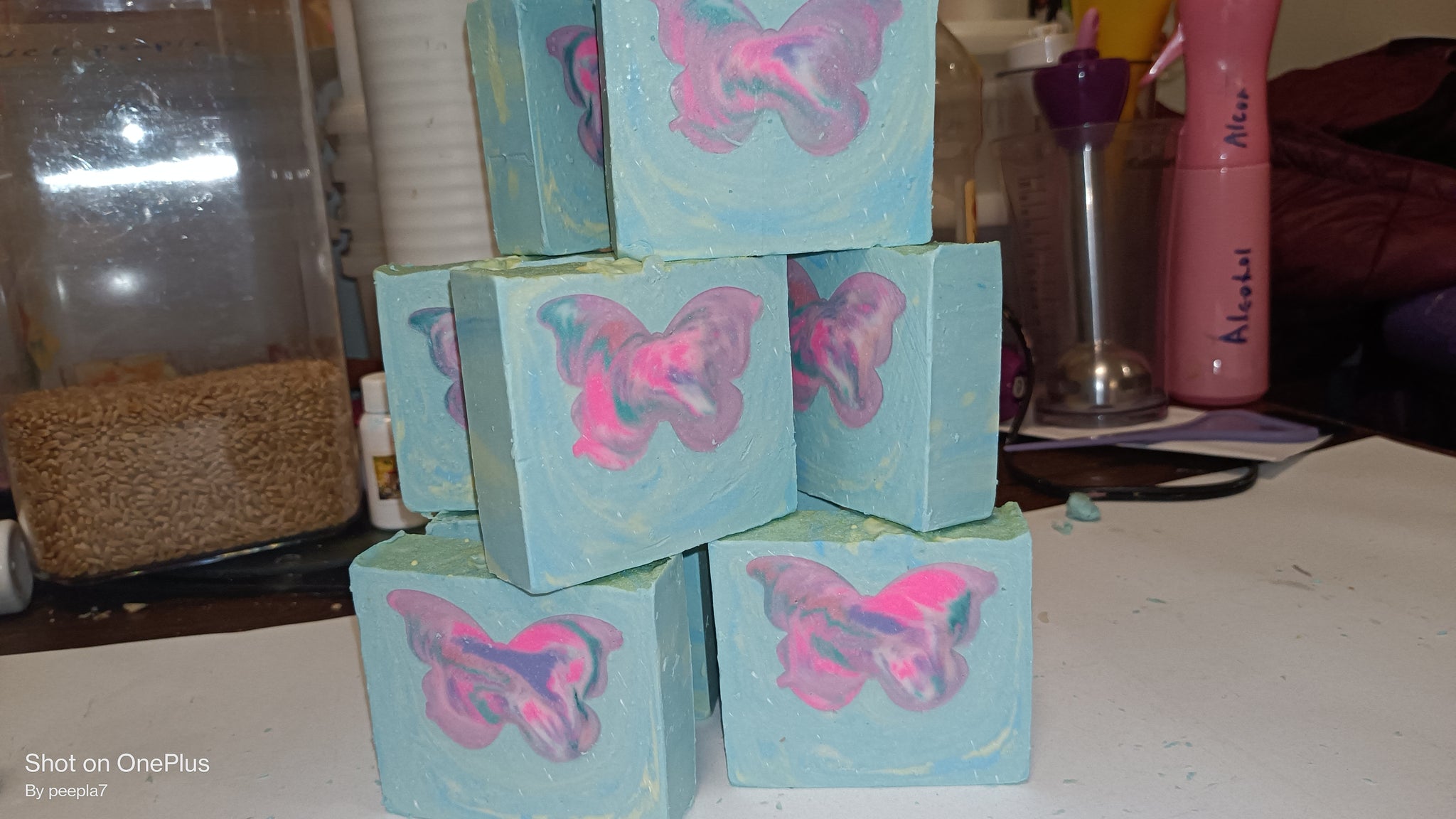 The scent of the butterfly is Narcissist*, a dupe of Narcisco Rodriguez cologne. The scent is trademarked and copyrighted so I can't name the resulting soap by that name. Therefore the name Blossom was suggested by Betty, and I added the name Butterfly.