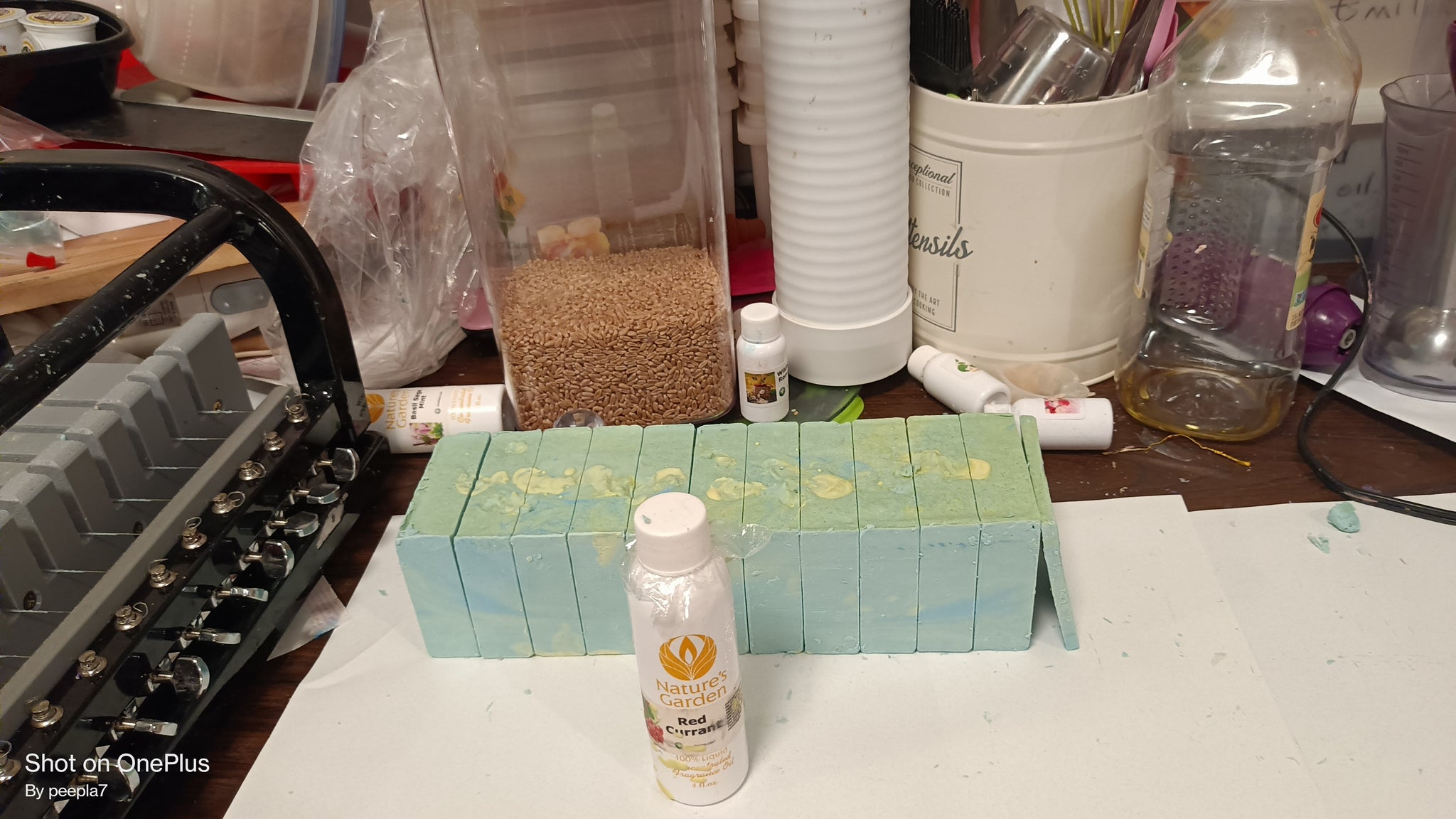 The face soaps are now called Blossom, the embedded butterfly....along with a new scent is called Butterfly Soap. This is me making the Butterfly Soap with Key West + TD for a sky blue effect, Bright Yellow Raincoat + TD for a sunshine yellow effect, the new scent...which plays well with the original scent is Red Currant.